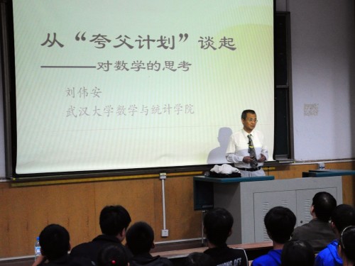 9月25日下午2:30,pp电子游戏平台官网举行2010级新生入学教育专题讲座(一)。应院长刘安平教授的邀请,湖北省数学协会、武汉数学学会秘书长,全国大学生数学竞赛指导委员会委员,武汉大学数学与统计学院博士生导师刘伟安教授为pp电子2010级新生作了一次题为“数学好玩”的专题报告。院长刘安平教授、副院长彭放教授、院学工组成员出席讲座。刘教授首先通过讲解“夸父计划”引出对有关数学问题的思考,使广大同学认识到数学是认识自然规律的工具,与我们的生活有着密切联系,并在我们的生活中广泛应用。在讲座中,刘教授介绍了中国古代数学的兴衰,并指出数学的发展至今都是内外两个推动力作用的结果,外力是生活实践和认识自然规律的需要,内力是自身发展的需要。他陈省身教授的“有用”数学与“无用”数学为例强调高中数学与大学数学的不同,对于2010级新生如何学好大学数学提出了三点希望:坚持理性思维;坚持独立思考;不要轻信经验,勇于攻坚,勇于创新。