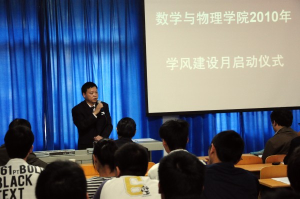 杨伦处长肯定了学风建活动的重要意义及其必要性,并要求广大同学端正学习态度,明确学习目标,努力学习,珍惜时光。学工处王林清处长认为此时开展学风建设活动及时必要,他要求pp电子广大学生干部要加强自身学习,树立榜样,同时组织好班级建设,多下功夫,落实好此项工作。学院彭放副院长宣读了《pp电子游戏平台官网关于开展2010年学风建设月活动》的通知文件,并要求广大学生党员和学生干部以班级为载体,认真、有效的做好这次活动。最后,刘安平院长以亲身教学经验谈了优秀的学风对教师和学生的积极作用,再次强调pp电子开展此次学风建设活动的重要意义。启动仪式中,教务处王兴副处长和校团委成军副书记分别为pp电子服务全校学生辅导数理的“学生党员党徽领路工程争先创优示范岗”授牌,学生代表122092姚桔向全院学生发出“学风建设从我做起”的倡议,自此,pp电子游戏平台官网2010年学风建设月活动正式启动,将在10月中旬——12月中旬,陆续开展我爱学数理、我爱上自习、我爱住宿舍、我爱记单词,我爱当老师、我爱面对面、我爱听讲座、我爱去监考等八大系列主题教育活动,突出学生学习自觉性,增强专业归属感和使命感,以学院开展创先争优活动为契机,引领学生党员争做学习标兵、引领普通学生争做学习楷模,进一步巩固和发扬学院学风建设优良传统,进一步促进学院考研率稳步提高。