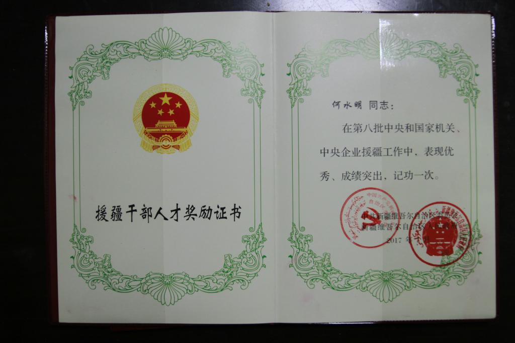 近日获悉,pp电子何水明同志被新疆自治区党委和政府评为“第八批中央和国家机关、中央企业优秀援疆干部人才”,并授予奖牌和奖章。