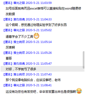 为了上好“宅家”实验课程,老师们也是费尽心思,多种线上模式同时运用,微课、直播、在线答疑,比以前更忙碌了,虽然和学生们远隔千里,但与传统授课时相比,已分不清课内课外,师生交流更频繁,联系也更紧密了。在老师们的带动下,学生们“宅家”实验的热情也像初夏的温度,节节高升,常常和QQ群里的老师们“聊”到深夜。经过两个月的奋战,宅家物理实验课程已到尾声,很多同学感慨宅家实验过程虽碰到各种困难,但通过自己搭建装置,自己想办法解决实验过程中碰到的问题,收获特别大,兴趣也特别高。从学生们的反馈来看,学生们除了学到物理知识,也掌握了很多的小技能,如专业拍照技巧、利用智能手机中的传感装置完成测量、借助各种软件完成数据处理等等,这都是传统的实验课程中学生们不需要掌握的。学生们还反馈到很多家长对我们的“宅家”实验教学反响很好,不少家长还饶有兴趣地亲自参与了实验,给同学们出谋划策,或上阵指导。一次始料未及的疫情,真正的将老师、学生甚至家长的主观能动性都调动起来了,教的水平和学的潜力都提高了,老师们也半开玩笑地说这次的教学课题没有立项效果却不输于立项。