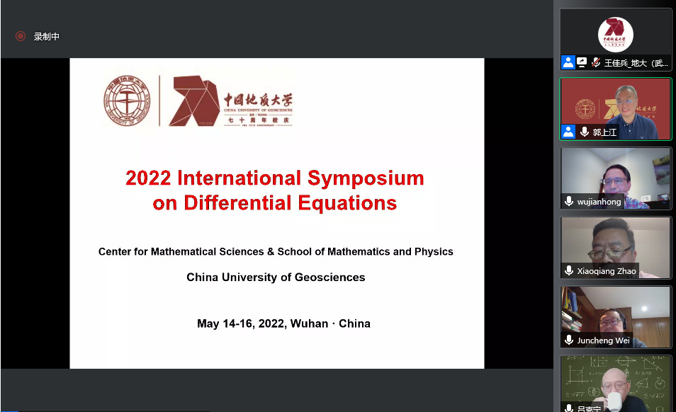 2022年5月14日至15日,中国地质大学(武汉)主办的“2022年微分方程国际研讨会(2022 International Symposium on Differential Equations)”在腾讯会议线上举行。此次国际会议是中国地质大学(武汉)70周年校庆的系列学术活动之一,以展示和介绍国内外微分方程定性与稳定性理论及应用的最新研究成果和进展为出发点,以加强国内外微分方程及相关领域的学术交流与合作为目的。大会开幕式由中国地质大学(武汉)pp电子游戏平台官网院长郭上江教授主持,中国地质大学(武汉)副校长刘勇胜教授以及加拿大应用数学首席教授(Canada Research Chair)、加拿大首席资深工业与应用数学主席、加拿大应用与工业数学会会长、加拿大约克大学疾病建模中心创始主任,危机与灾难模拟快速反应项目创始主任吴建宏教授分别致辞。