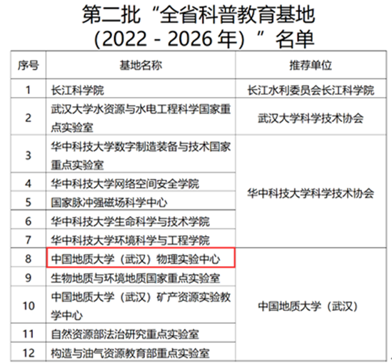 物理实验中心继认定为2021-2025年度第二批武汉市科普教育基地的基础之上,不断完善科普软硬件条件,加大科普活动组织力度,积极组织撰写申报材料、经过中国地质大学(武汉)科学技术协会推荐、专家评审等环节、综合评审、网站公示等流程后获此殊荣。下一步,物理实验中心将认真对照《湖北省科普教育基地认定与管理办法》相关要求,充分发挥基地的功能和作用,扩大科普活动宣传面,全面提升科普服务能力,充分发挥科普基础设施的功能和作用,助力湖北省科普教育事业发展壮大,为提升全民科学素质作出积极贡献。