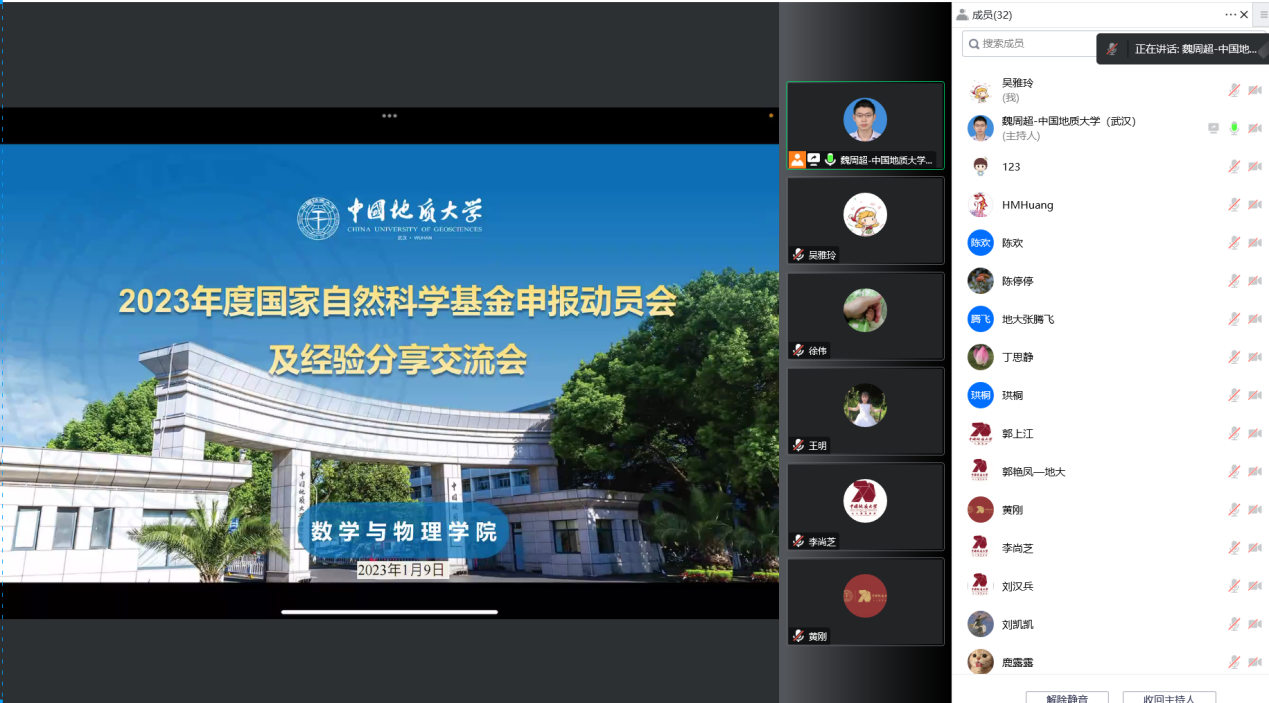 为提高国家自然科学基金项目申请质量与成效、提升学院科研建设水平,pp电子于2023年1月9日以线上的形式召开了2023年度国家自然科学基金项目申请动员会和经验交流会,学院党委书记吴太山,院长郭上江,副院长魏周超、黄刚、张保成以及学院40多名中青年骨干教师参加会议。会议由魏周超副院长主持。