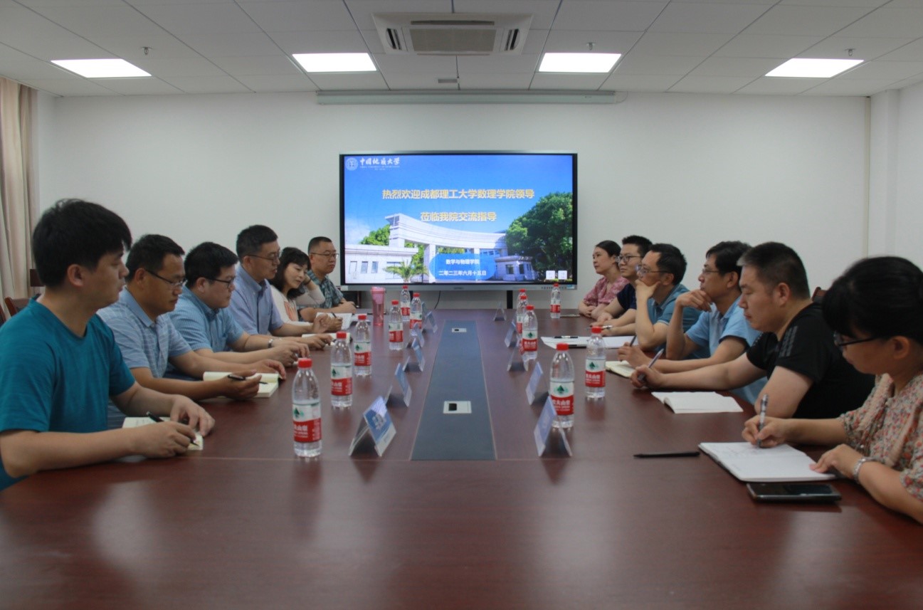 2023年6月15日下午,成都理工大学pp电子游戏平台官网副院长张传瑜、基础数学教学部主任余海洋、基础数学教学部支部书记舒畅、大学物理教学部副主任史顺平、田荣刚等一行来pp电子进行工作交流。学院副院长黄刚、副院长张光勇、大学物理教学部主任陈琦丽、数学系主任王毅、大学数学教学部主任郭艳凤、物理实验中心主任何开华出席了此次会议。会议由副院长黄刚教授主持。