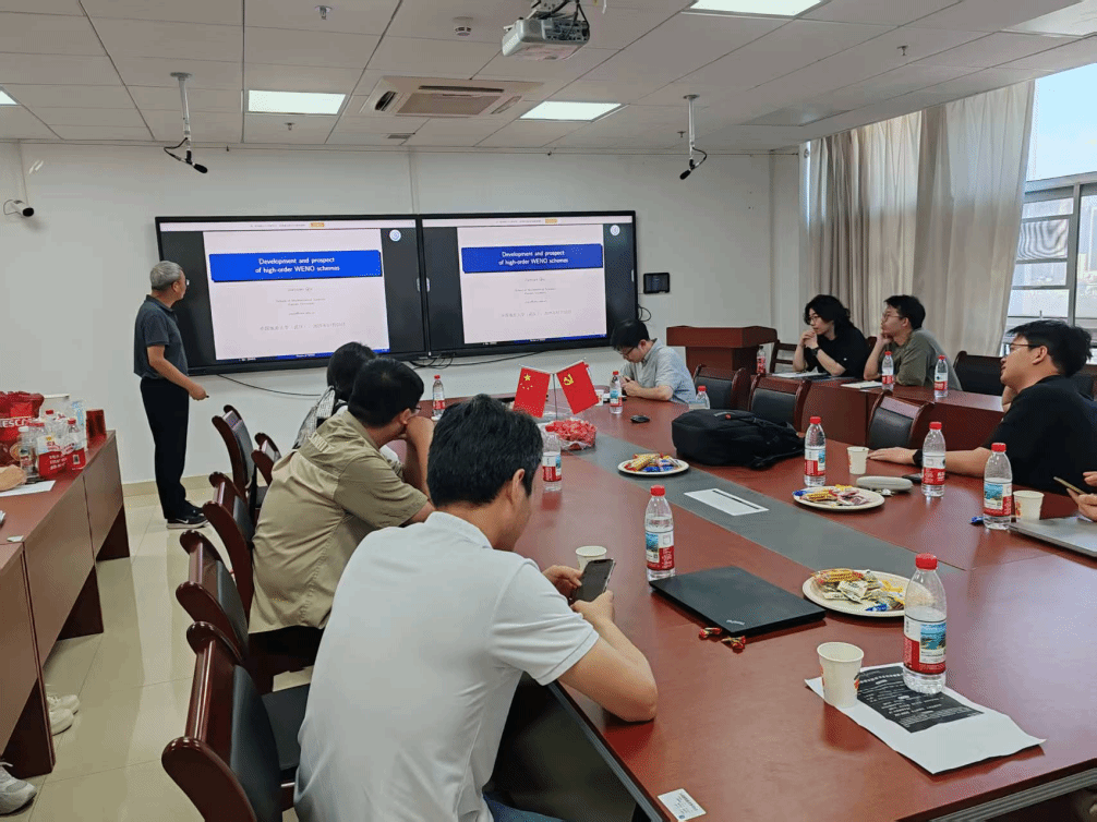 随后,各校友学者分享了最新研究成果,探讨行业发展趋势,提出多项合作建议。邱建贤教授(厦门大学,pp电子1982届毕业生)以《Development and prospect of high-order WENO schemes》为题,系统阐述了高阶WENO格式的发展历程与前沿应用;肖敦辉教授(同济大学,pp电子2008届毕业生)聚焦非线性模型降阶方法,分享了其在工程计算中的创新成果;赵状副教授(厦门大学,pp电子2015届毕业生)介绍了三角形网格上基于高阶矩的Hermite WENO格式研究;李佳音副教授(兰州大学,pp电子2018届毕业生)则探讨了顶点辅助空间多重网格方法在线性弹性方程中的实践。