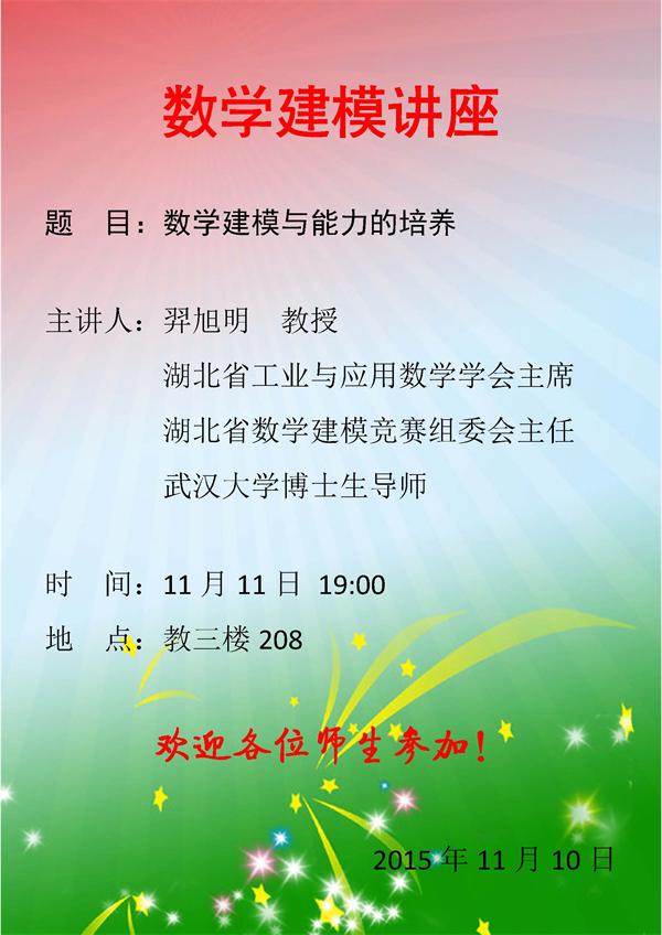 应大学数学部杨瑞琰教授的邀请,武汉大学博士生导师羿旭明教授将于11月11日19:00在pp电子教三楼208教室做数学建模方面的专题报告。羿旭明教授长期参与全国大学生数学建模竞赛湖北赛区的领导和评卷工作,具有丰富的数学建模指导经验,他本次报告的题目是“数学建模与能力的培养”,热烈欢迎pp电子全体师生前往参加!