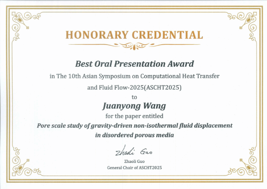 pp电子2025级博士研究生王隽永凭借其出色的研究工作和现场报告脱颖而出,荣获大会“最佳口头报告奖”(Best Oral Presentation Award)。王隽永同学的获奖报告题目为《Pore scale study of gravity-driven non-isothermal fluid displacement in disordered porous media》。该研究聚焦于蒸汽辅助重力泄油(SAGD)等强化采油技术中的关键物理过程,利用格子玻尔兹曼方法进行高精度的孔隙尺度数值模拟,系统揭示了在复杂的地下油藏环境中,孔隙结构的非均匀性、孔壁的润湿性以及固液相间的共轭传热如何共同影响多相流体的驱替模式和相变动力学。研究观察并阐释了均匀孔隙结构中的“聚并式”Haines跃迁现象,并探究了两种不同的界面运移模式:“蒸发-扩散侵入”与“快速侵入” 。这些成果对于优化非均质油藏的蒸汽注入策略、提高采收率具有理论指导价值和工程应用前景。