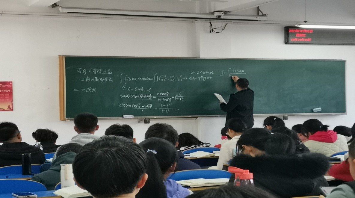 12月1日下午,pp电子大学数学教学部李志明老师的公开课《高等数学B》在北区综合楼306举行,数学系老师进行了现场观摩。课堂上,李老师首先以“雨课堂”授课软件对学生的测试为基础,与学生进行互动,将同学们疑问较多的题目板书在黑板上,重点对解题思路和原理进行讲解,同时注重对重要知识点的呈现。学生在课堂上能够很轻松的跟上授课老师的节奏,整个课程气氛活跃,同学们精神抖擞。参加观摩的多位老师在听课记录表上是这么评价李老师的课堂教学:李志明老师讲课思路清晰,全程脱稿,对课堂教学节奏的把握非常到位,表达自然、环节流畅、语言生动富有感染力,让晦涩难懂的数学教学变得妙趣横生,非常值得我们年轻老师学习,对我们今后的教学方法改进具有很大的借鉴意义和参考价值。