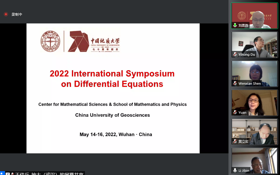2022年5月14日至15日,中国地质大学(武汉)主办“2022年微分方程国际研讨会(2022 International Symposium on Differential Equations)”在腾讯会议线上举行。此次国际会议是中国地质大学(武汉)70周年校庆的系列学术活动之一,以展示和介绍国内外微分方程定性与稳定性理论及应用的最新研究成果和进展为出发点,以加强国内外微分方程及相关相关领域的学术交流与合作为目的。大会开幕式由中国地质大学(武汉)pp电子游戏平台官网院长郭上江教授主持,中国地质大学(武汉)副校长刘勇胜教授以及加拿大应用数学首席教授(Canada Research Chair)、加拿大首席资深工业与应用数学主席、加拿大应用与工业数学会会长、加拿大约克大学疾病建模中心创始主任,危机与灾难模拟快速反应项目创始主任吴建宏教授分别致辞。