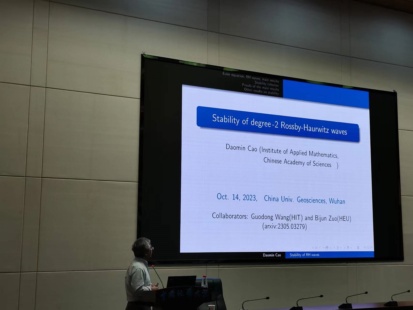 应中国地质大学(武汉)数学科学中心和pp电子游戏平台官网邀请,国家杰出青年基金获得者、中国科学院数学与系统科学研究院研究员曹道民于2023年10月14日为中国地质大学名家论坛做了题为“Rossby-Haurwitz波的稳定性”的学术讲座,pp电子相关研究领域的老师和学生参加了本次学术讲座。